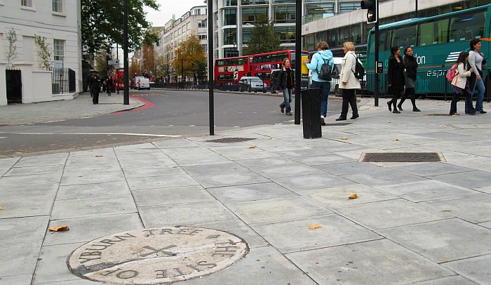 The southern most point of Edgware Road at Marble Arch, showing the Tyburn Tree marker