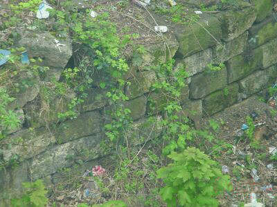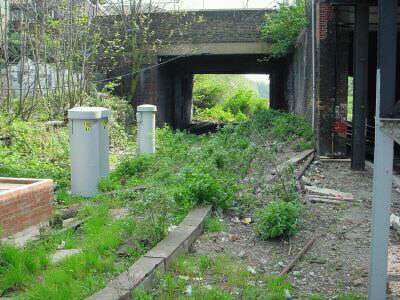 At the country (or Croydon) end of the station the canal passed through the left hand bridge hole. The bridge is thought to reflect the site of the old canal bridge here, and the location of Lock No.3. The canal then veered to the east towards Shardeloes Road. Below left is a close up of the bridgehole. The grey control boxes are about at the former entrance to Lock No.3. Behind them, further to the left in the undergrowth, are stone blocks that are said to be the remains of the lock, or canal bridge, or whatever. Now that it has been found that the canal did exist at the same time as the railway the origin of these stone blocks are more obscure than once thought