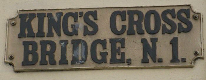 Kings Cross Bridge – old street name sign on the side of the Scala entertainment centre. This sign can be seen from Kings Cross station (see below)