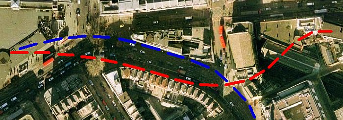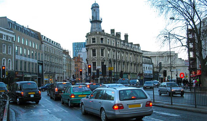 The roads outside Kings Cross station with the ‘lighthouse’ prominent. The red circle on the right marks the street sign (Kings Cross Bridge) shown earlier. The Fleet River heads more or less diagonally across the picture from the red circle to the foreground where the silver and turquoise cars are waiting for the traffic lights. The Fleet then headed down Euston Road (in front of the station) and then enters a cast iron conduit to cross the Metropolitan Railway tunnels