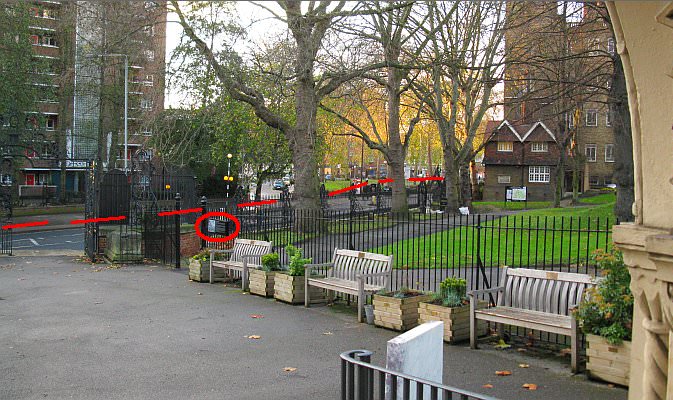 Looking from the front porch of St Pancras church towards the course of the Fleet River as it heads towards Camden Town. The information board (circled) shows a picture of the Fleet in 1827 (see below)