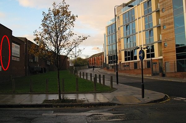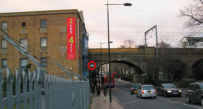 Looking from the bridge over the canal along Kentish Town Road. The road falls towards the Fleet’s valley before climbing again towards Kentish Town. The river would have been somewhere about where the people are walking on the pavement near the bus. The red circle indicates ‘Water Lane’ on the side of the railway viaduct. This is discussed below.