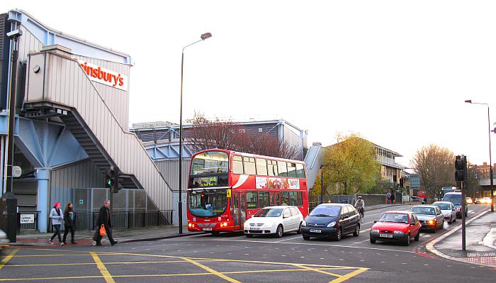 The Fleet wold have passed under the BTP headquarters in Camden Road (just off the right side of the picture) and then on an alignment underneath where this red bus stands waiting for the lights off Camden Terrace onto Camden Road. The parapet of the bridge across the Regents Canal can be seen behind the cyclist.
