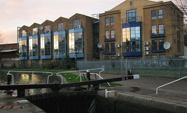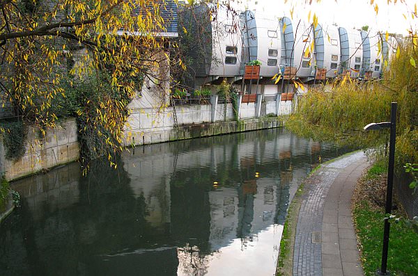 This is Kentish Town Lock. A short distance away where these new houses are, the Fleet River veered away from the Regents Canal, and headed due north. The two branches of the river, from Hamsptead and Highgate merged about here to form a common route to the Thames at Blackfriars.