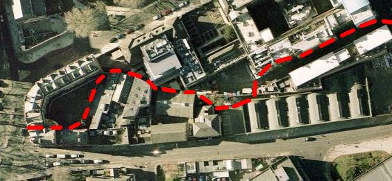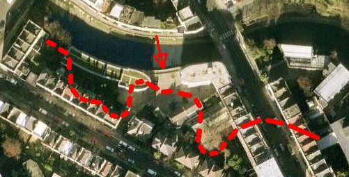 The ‘Thalweg’ (the valley) that the Fleet ran through can still be made out on the canal’s offside where the land drops to the level of the blue house. The Fleet passed from the parked blue mini and made its way across the forecourt to the white building on the right. Admitedly the land is now higher than it once was as the river’s course has been filled in, but this the best proof so far in the Camden area of the former existence of the Fleet River. The whilte building with balconies (extreme right) is actually where the Fleet made one of its closest approaches to the Regents Canal. Its interesting how the large tree fits into the large loop of the Fleet Rver at the bottom of the picture. The tree certainly knows something we don’t! The red arrow in the picture below shows the perspective from Lyme Terrace. Royal College Street bridge is at the top and Camden Road bridge at the far left.