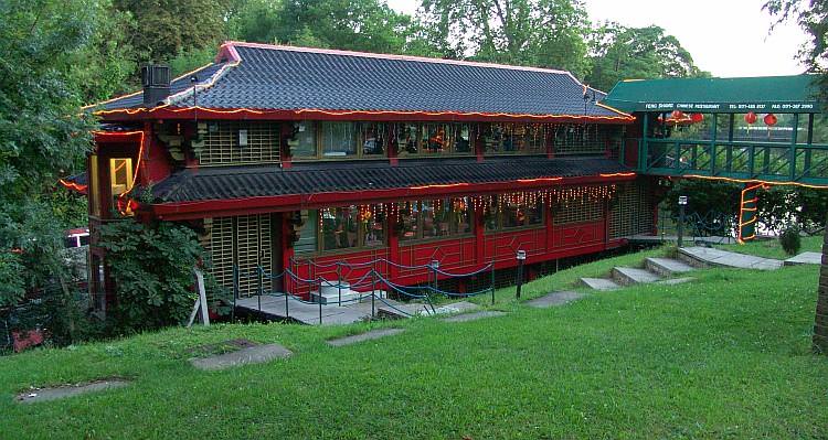 A close up of the Feng Shang Chinese restaurant. This unusual style floating eatery is top heavy and is actually held stable by the footbridge.