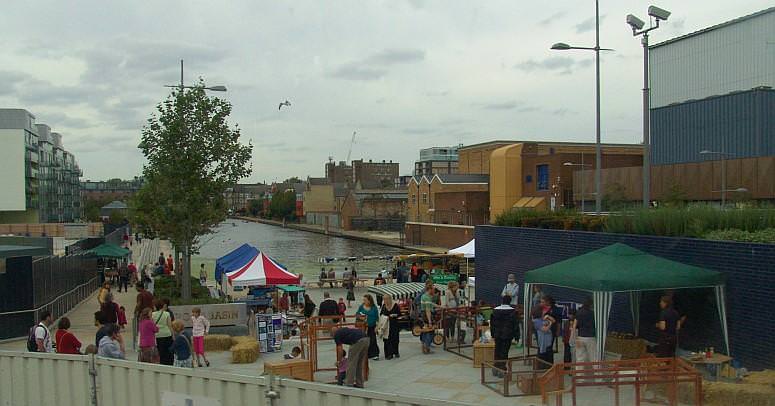 The view below was taken from the upper deck of a 43 route bus travelling down City Road. The stalls are part of the Angel Canal Festival 2009. The view has now changed beccause of new development around the southern extremity of the basin.