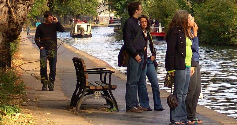 Regents Canal towpath activity – man chatting on mobile & group admiring the zoo animals. A private boat, a waterbus & My Fair Lady are in the background.