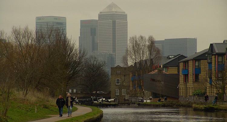 View of the Canary Wharf buildings and Mile End lock. Notice the lock-keepers house with its modern extension.