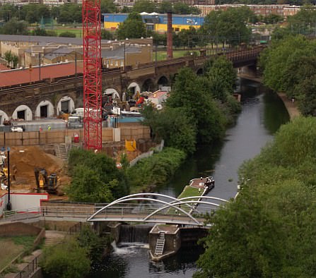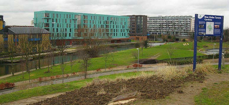 The new ‘hill’ by Mile End lock gives a good view of the Regents Canal, the new developments along it, and trains on the Great Eastern main lines. The whole area used to be part of the New Globe Tavern gardens between 1820 and 1860. The gardens were a more elaborate version of those at Anerley on the Croydon canal and offered refreshments, music, hot air balloons, illuminations and fireworks.