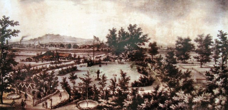 This is the New Globe Tavern Gardens as depicted on the information boards on the hill and along the canal. In the distance is what many might assume to be Hampstead Heath, but I think its actually a rather enhanced Stamford Hill! The Regents Canal runs along the left side of the picture, and moored at a wharf (with the red buildings) is a barge that has sails. The Eastern Counties Railway (later the Great Eastern railway) line can be seen crossing the centre of the picture.