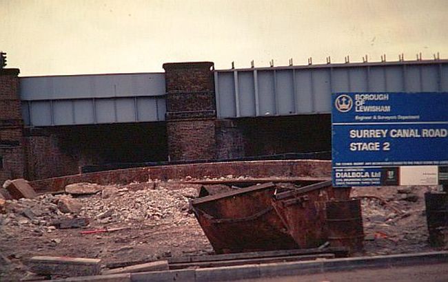 A little bit of history. Remains of the canal at the London and Greenwich crossing had been filled in and the road in front was being remodelled to form the junction with the new Surrey Canal Road. This photo I took in 1984.
