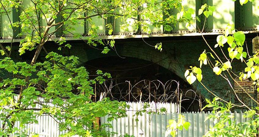 The same bridge today – its arches are used as a car repair yard by the name of Surrey Canal Commercials.