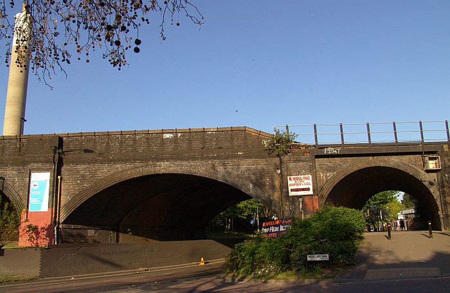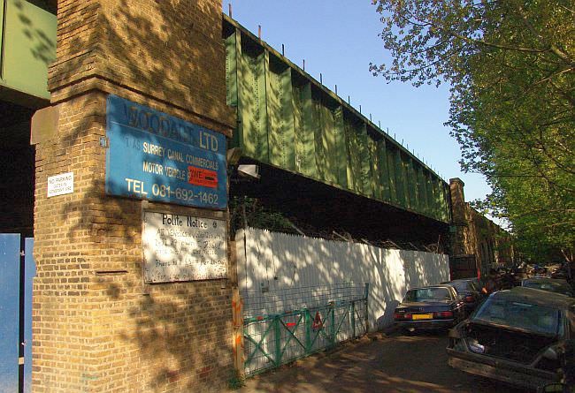 Surrey Canal Road bridge carrying the London – Croydon railway over the former canal alignment. This location is actually the junction where the Croydon Canal left the Surrey Canal on its journey southwards.