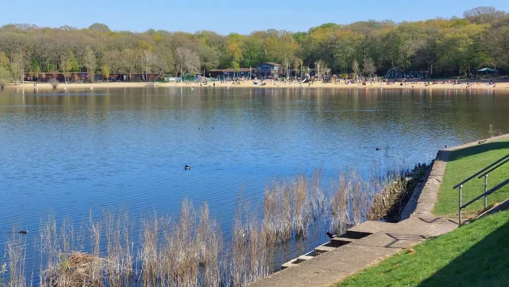 A view of Ruislip Lido looking towards the popular beach area and cafe, taken in 2025.
