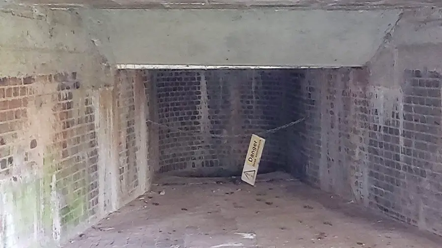 2025 view showing the sluice’s interior with its funnel down which the water once dropped down to canal feeder level.