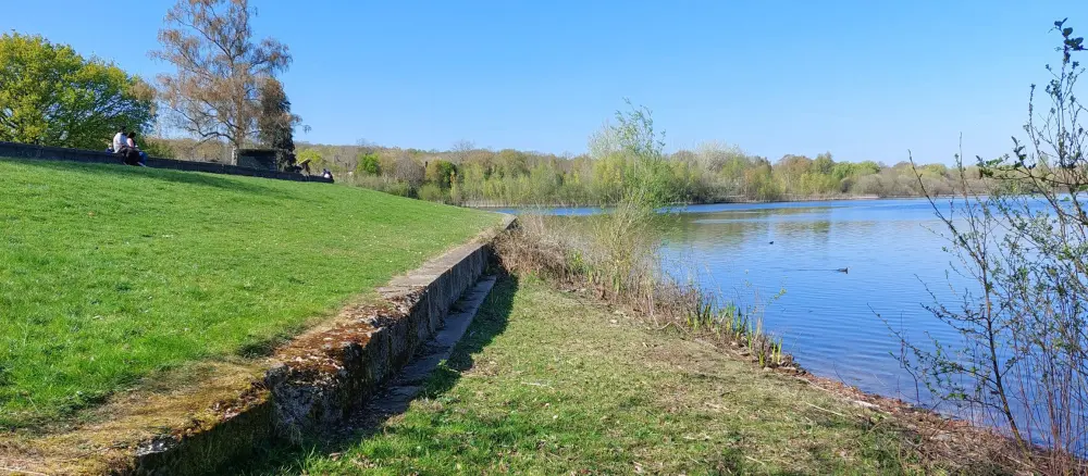 A 2025 view of Ruislip Lido showing how the water levels are today kept well below what it once was.