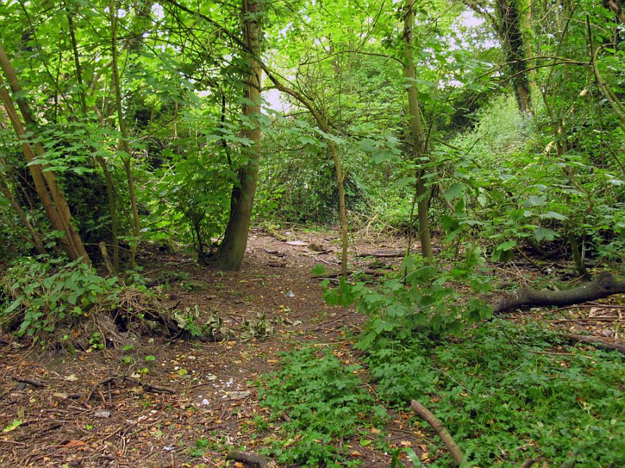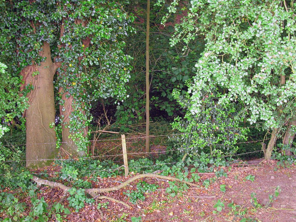 Although this section is difficult to access there are some points at which this section can be observed, by using a track that veers off to the east (Google) at Milkingpen Lane, where it meets the railway bridge, and fighting through undergrowth in the woodland as far as a barbed wire fence, so as to gain the perspective to the south east.