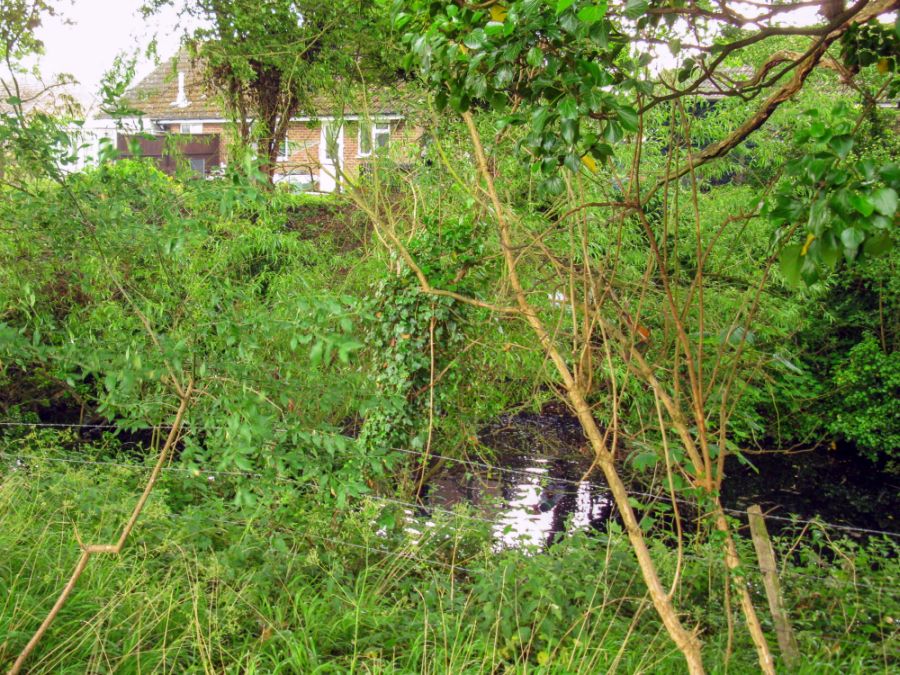 Past the car showrooms at The Hatch, the canal’s course can be discerned quite easily from the A30, although the first part is actually gardens off Cavalier Road. The canal’s course is essentially dry and overgrown but is soon back in water and enters a substantially long and deep cutting. Before it enters this deep cutting the watercourse runs to the rear of properties in Cavalier Road.