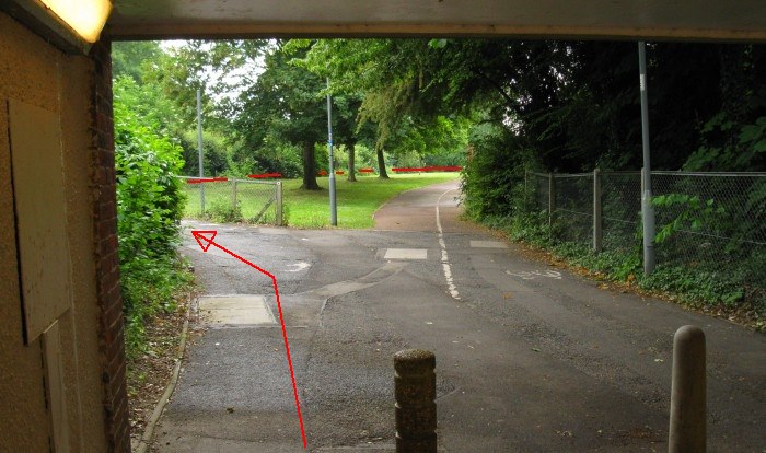 Looking from the Ringway underpass towards Eastrop Way. The heritage train follows the direct pathway into Eastrop Park. Actually the canal was further to the south – its north boundary is marked by the red line in the background. The red arrow indicates the correct route to gain access to the canal alignment.