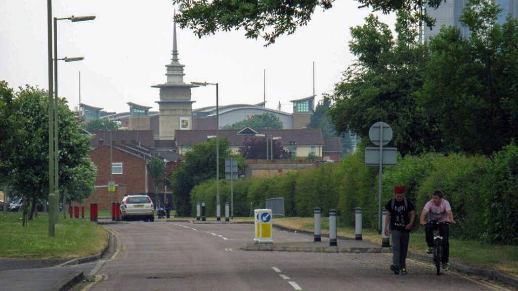 Eastrop Way – the course of the former canal as it heads towards the centre of Basingstoke. The two guys are by the tree that has just been discussed.