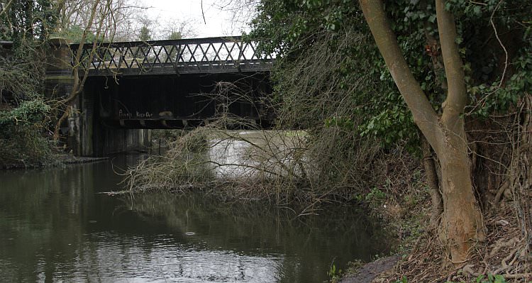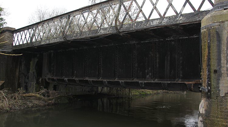 The underside of the aqueduct showing the trough carrying the water channel low-slung across the Colne Brook.