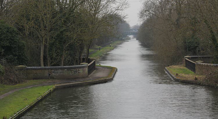 Cowley Peachey Junction with the Slough Arm stretching into the distance. Many canal chroniclers claim the stop gates at the entrance to the arm are the only set found on the Slough Arm. This, like the aqueducts, is a common bit of mis-information for there is another pair of stop gates at Bridge 11.